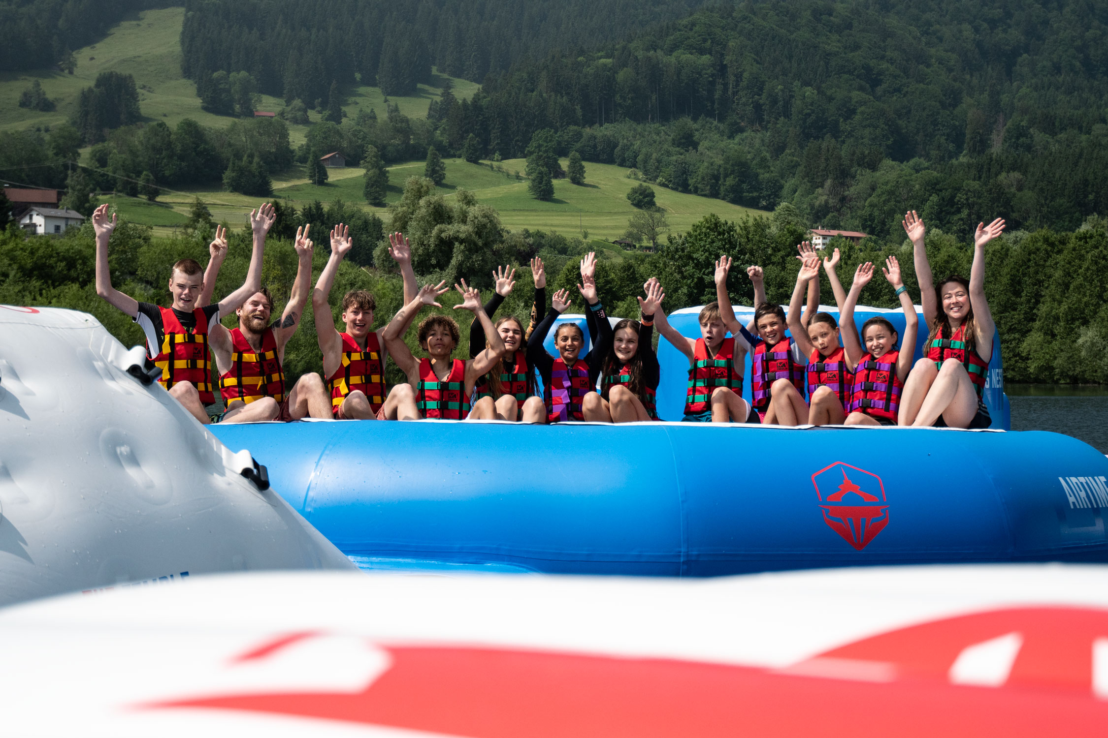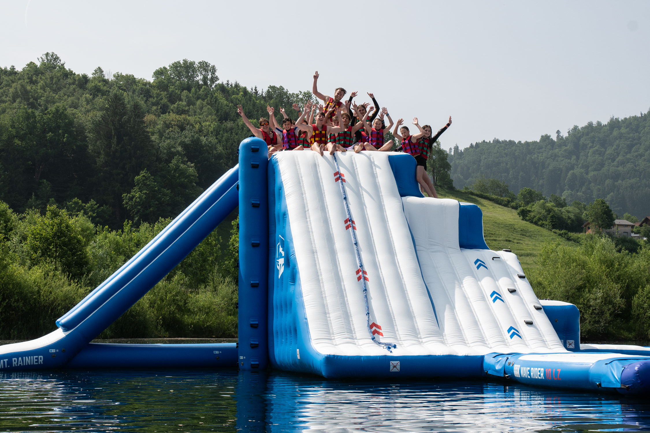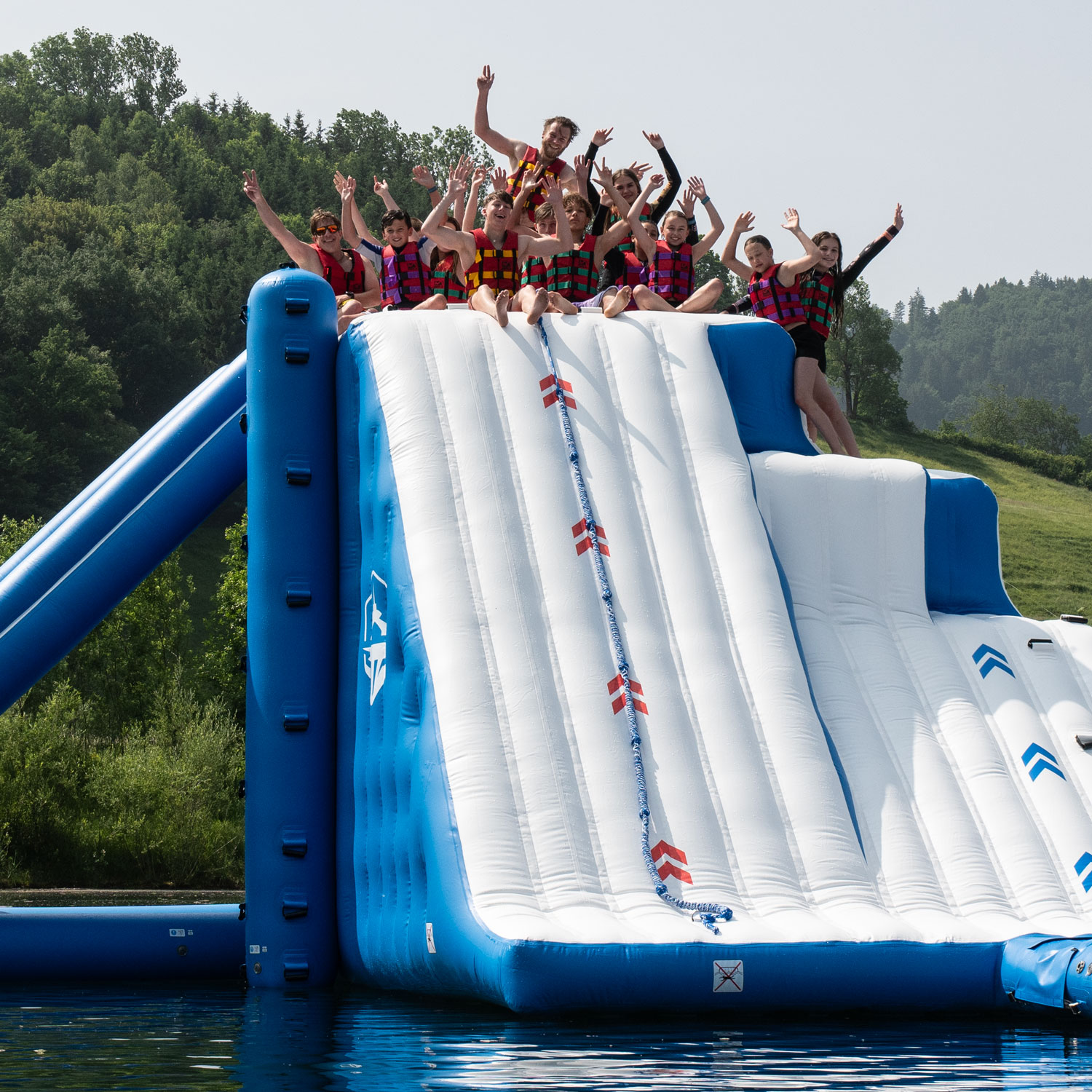 Von bis zu 3,5 m hohen Sprungtürmen springen, sich von einem Blob durch die Luft katapultieren lassen, aufregende Klettertürme erklimmen, über die große Rutsche in kristallklares Wasser rutschen, balancieren, hangeln oder auf dem großen Wassertrampolin ins Wasser hüpfen: Auf dem größten schwimmenden Aqua Park in Bayern erleben große und kleine Teilnehmer einen spannenden Tag am Inselsee in Blaichach.