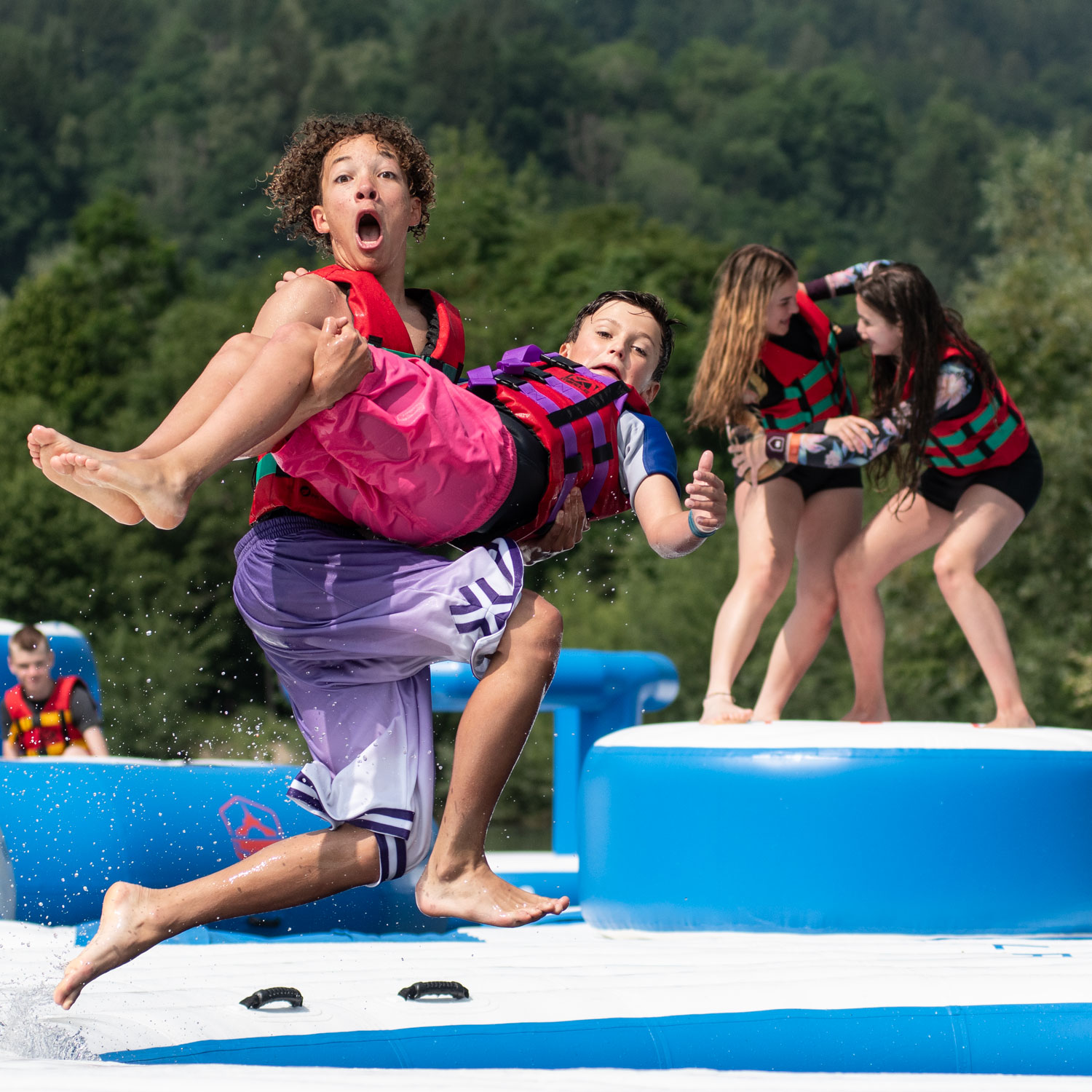 Erkunde im schwimmenden Kletterpark 30 unterschiedliche schwere Kletterelemente. Nach jedem Kletterabschnitt erwartet Dich eine neue Herausforderung – oder ein Sprung ins erfrischende Wasser!